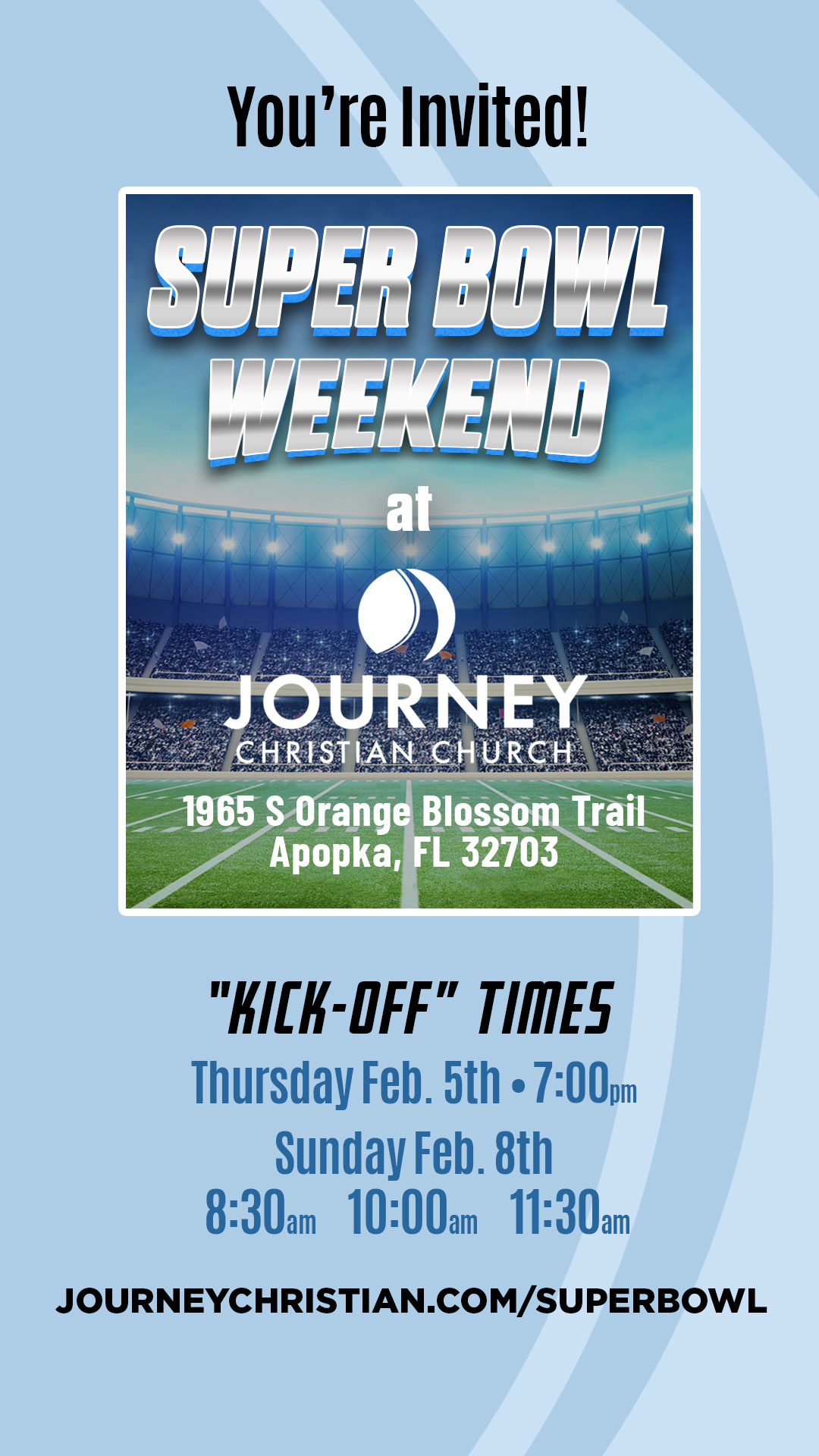 We’d be honored for you to be our guest and join us on Super Bowl Sunday for a fun, family-friendly experience and a welcoming church service that will include football-themed games, and more! Wear your favorite football Team/Jersey!